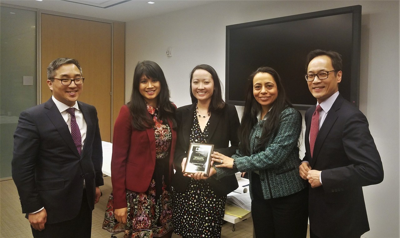 On Tuesday, February 13, 2018, at the Annual Meeting of Members, AABANY presented the Committee of the Year Award to the Immigration Law Committee for their impactful programming throughout 2017 to help protect and advance the rights of immigrants during a year when immigration news and issues were at the forefront. Accepting the award are Co-Chairs Amanda Bernardo, Susan Akina and Poonam Gupta (l. to r.), flanked by President Dwight Yoo on the left and Executive Director Yang Chen on the right. Congratulations to the Immigration Law Committee on a well-deserved award! For more information about the Immigration Law Committee, visit this link. (Photo: Tristan Loanzon.)