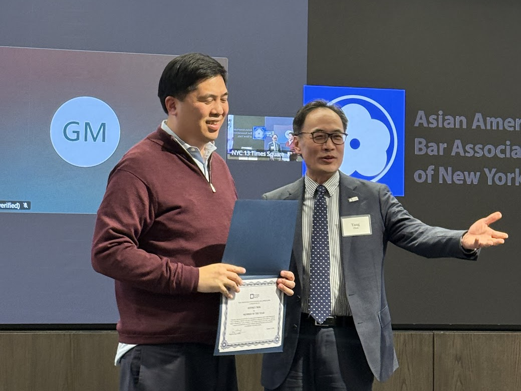 The Member of the Year Award was presented to Jeffrey Mok for his exceptional dedication and contributions to AABANY over the past year, including his outstanding work as the Co-Chair of the IP Committee and organizing many popular and worthwhile events, such as Board Games Nights and the Dumplings & Discussion series.