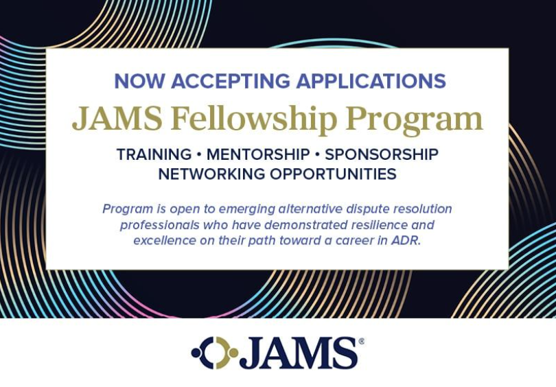 The JAMS Fellowship Program, designed to help expand and diversify the pipeline of future alternative dispute resolution (ADR) professionals, is now accepting applications. Through education, mentorship, and hands-on exposure for attorneys who are interested in pursuing careers as mediators and arbitrators, the program provides fellows with training, access to experienced neutrals, and insight into the practice of ADR.
