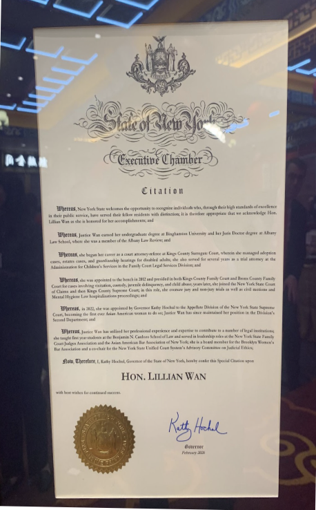 The Special Citation from Governor Hochul captures both the breadth of Justice Wan’s career and the philosophy that has defined it, recognizing her historic appointment to the Appellate Division, Second Department, alongside her leadership in the organizations that uplift Asian American attorneys, women in law, and the broader legal community. It is a recognition that spans decades of work, from her earliest years on the bench to the mentorship and visibility efforts she continues today. Justice Wan has spent her career being the judge she did not see when she was a young attorney, and in doing so, has made sure that fewer people will have to wonder whether someone like them belongs on the bench.